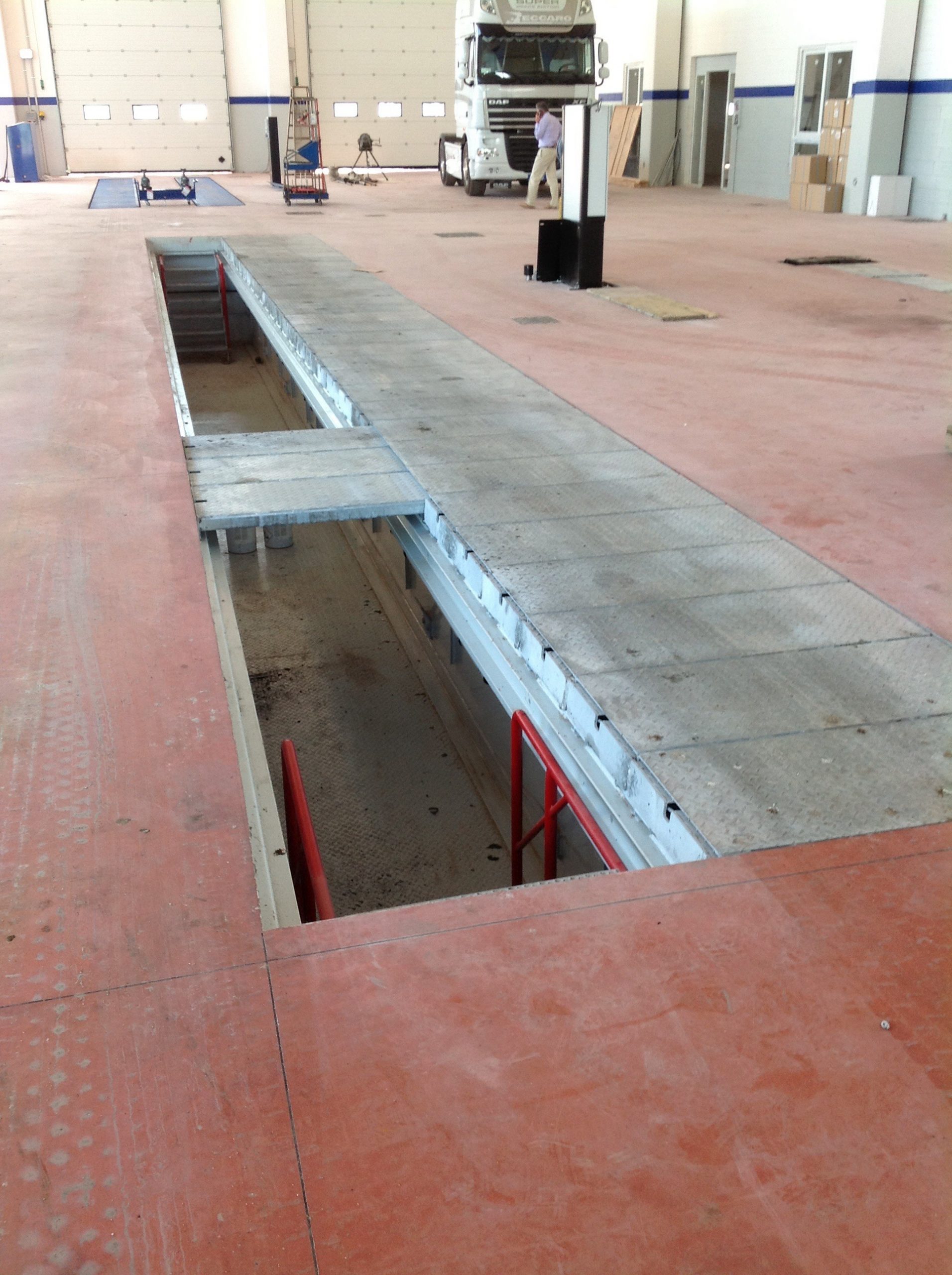 Fossa lavoro 15 metri Fossa lavoro prefabbricata in acciaio autoportante con copertura a cassetti carrabili manuali, portata 1 ton.