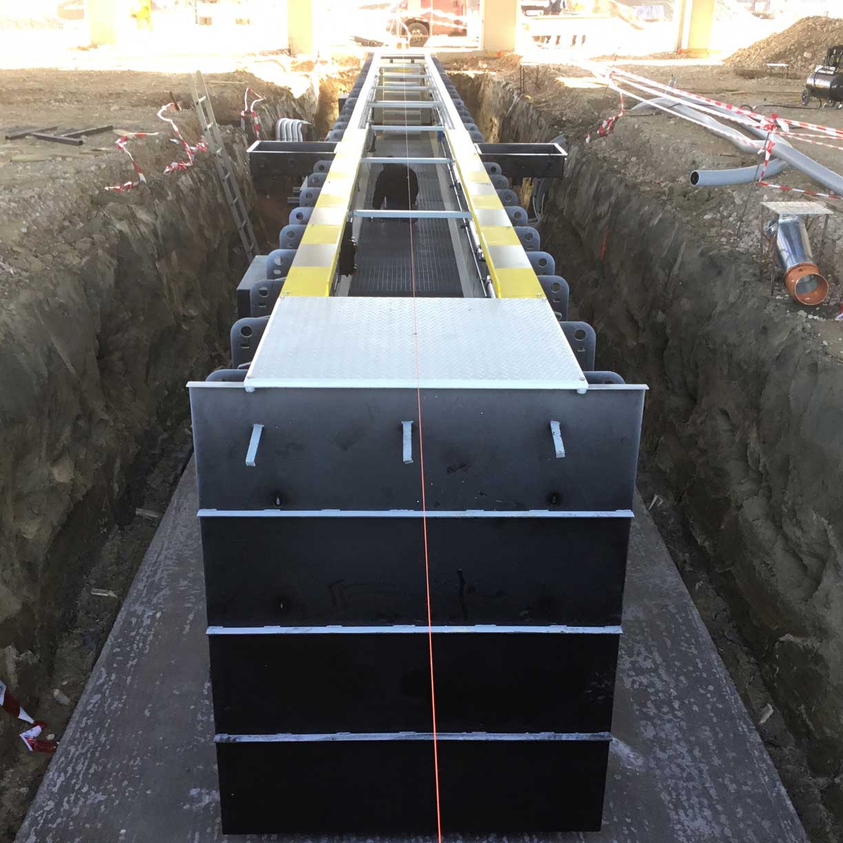 Fossa da 22 metri ibrida , doppia altezza per lavoro e revisioni , doppia misura bocca per lavoro e revisioni , con ganci e sistema predisposizioni attrezzature per raddrizzature telai ed assali . Con copertura in tende automatica . nuova generazione di fosse per più lavori conglobati.