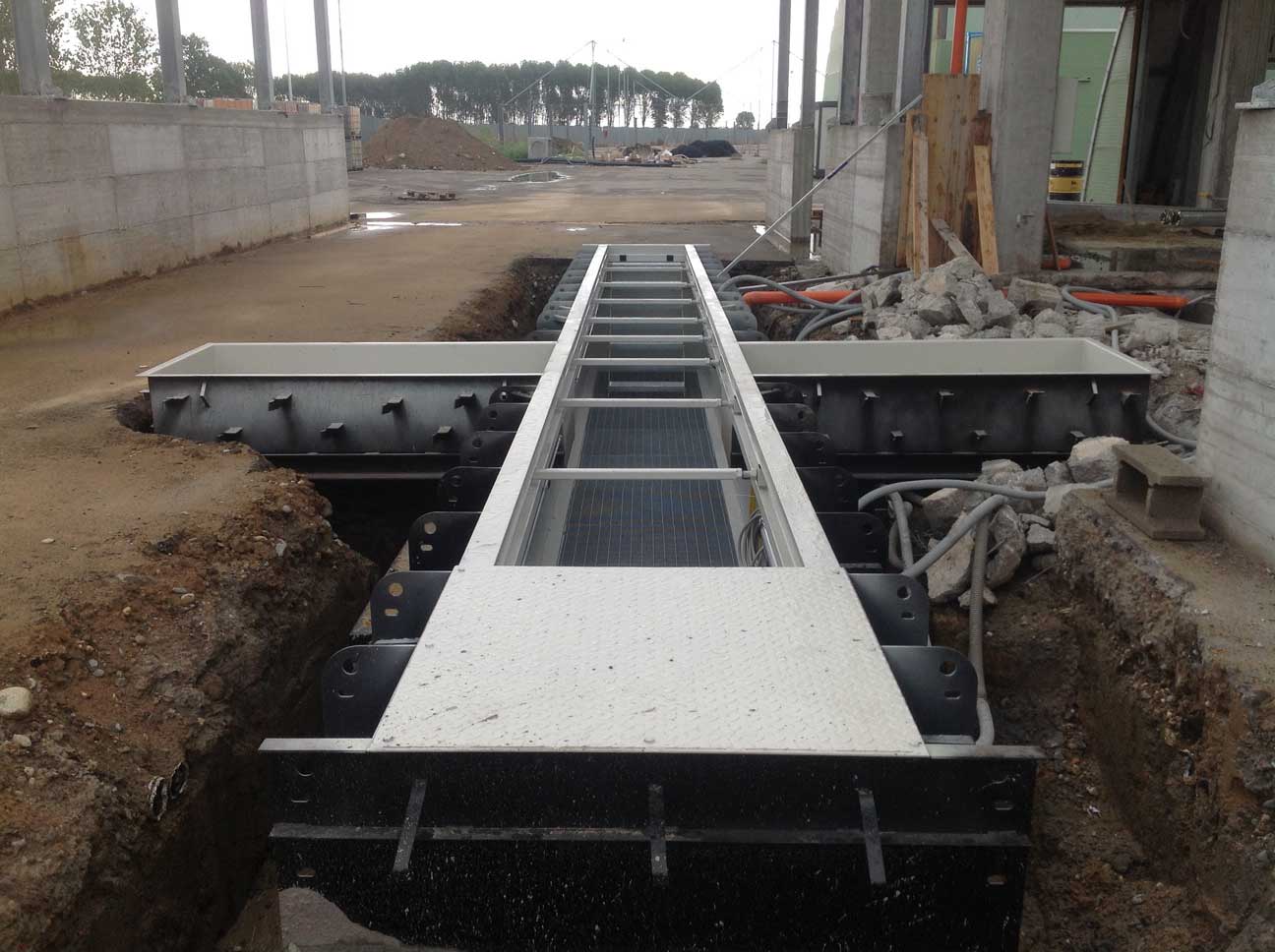 Fossa lavoro con banco prova freni e giochi incastonati marca AHS per pre revisioni . Fossa ibrida per lavoro su gruppi e linea pre revisioni. Modello AP tutto autoportante.