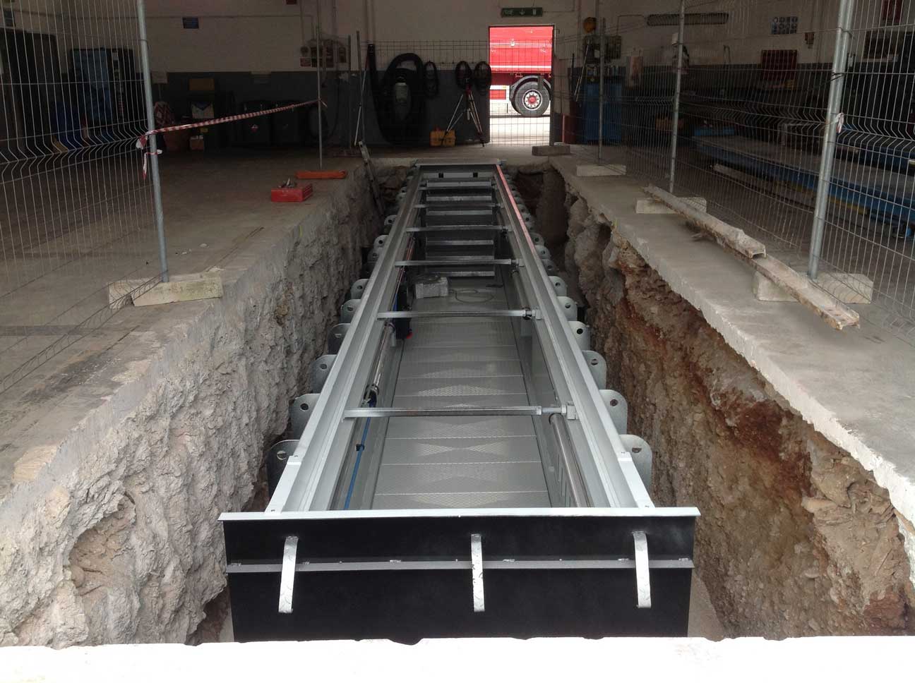 Fossa auto portante modello AP da 12 metri , con coperture carrabili e doppia pavimentazione in pannelli acciaio mandorlato mobili . Più pulizia e praticità .