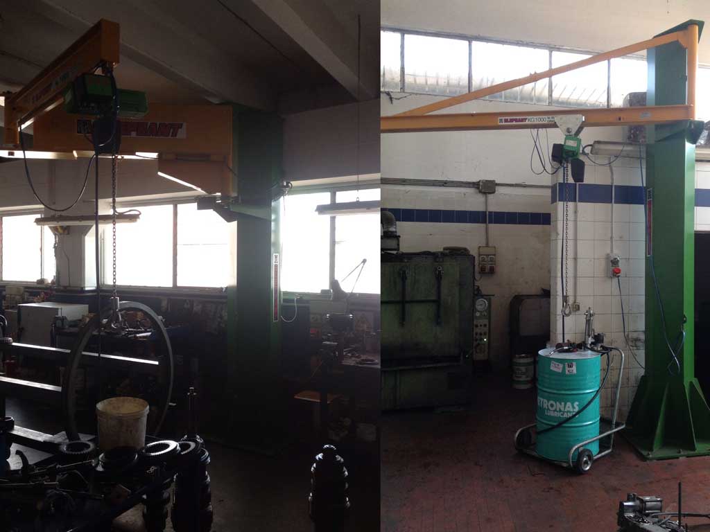 Esempio risoluzione esigenze cliente con due paranchi a bandiera progettati a misura e speciali per reparto lavaggio e reparto revisioni cambi ZF. Sempre eseguiti a misura e a doc per il cliente e situazioni di portate e spazi. Certificati.