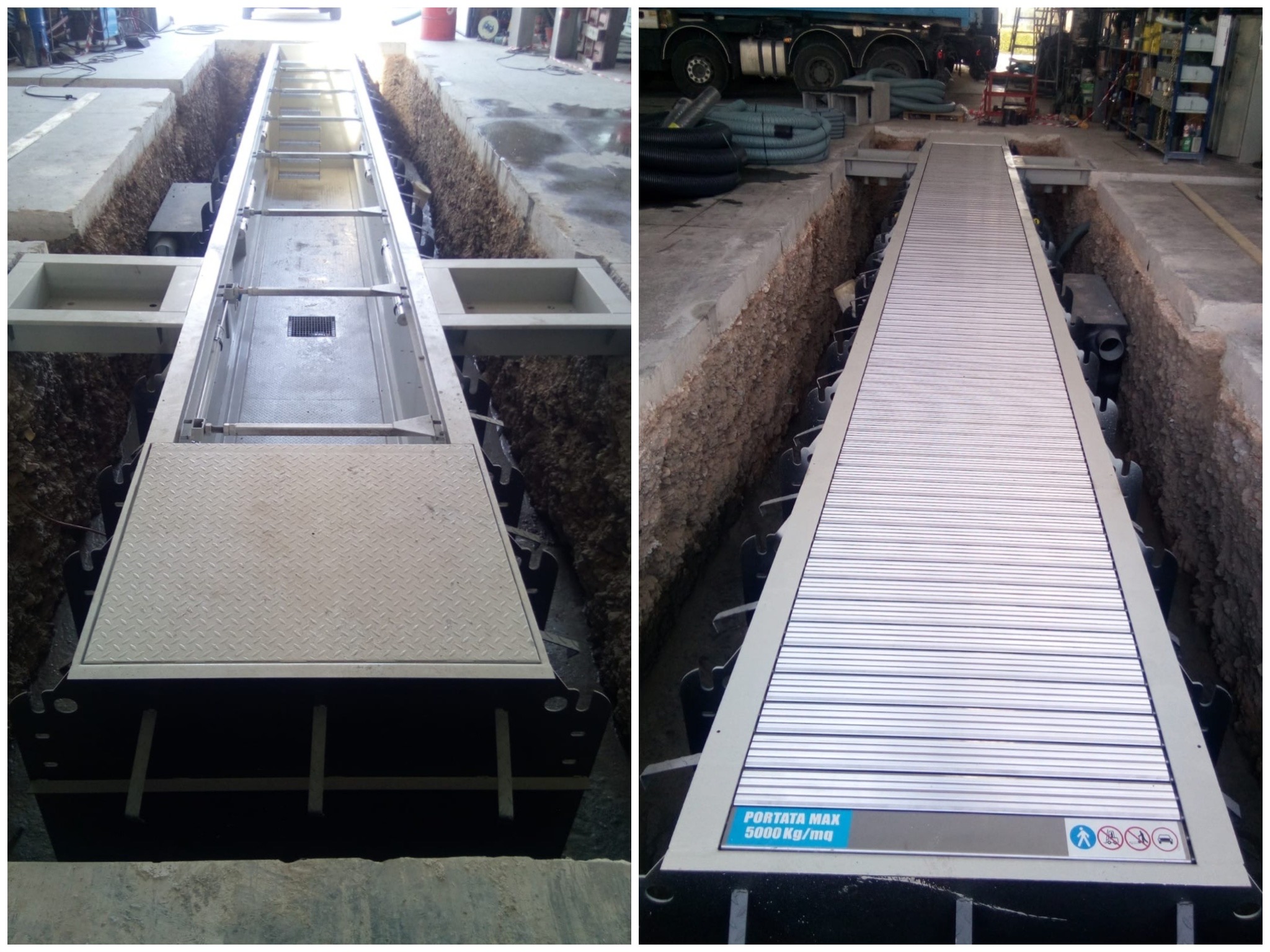 Altro esempio , fossa da 12 metri per pre revisioni con banco prova giochi e coperture motorizzate Global Team modello Alu Snake 5000 kg./M2 .