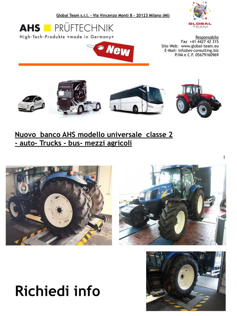 Con le nuove normative nel campo linee revisioni ci saremmo moltissime novità nel 2015. Vi presentiamo nuovo banco freni universale con bancata rulli ideata per sopportare tutte le novità' che verranno presto in vigore , come pure la possibilità' della prova dei mezzi agricoli. Prossime normative in arrivo. Non esitate a richiederci info al riguardo.