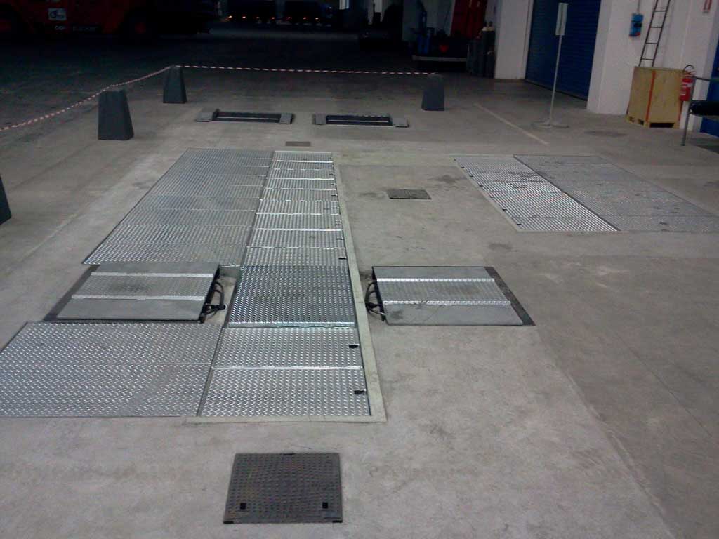 Fossa revisioni UNI9721 con coperture a cassetti carrabili manuali . Soluzione fossa a scomparsa in modo completo. Più' linea revisioni Trucks.