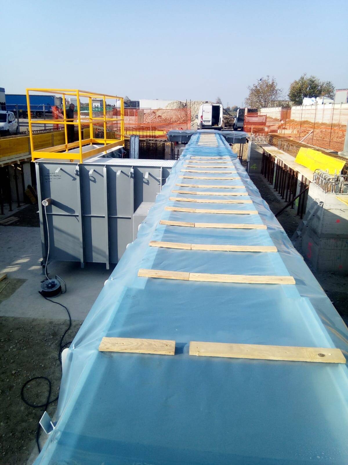 Esempio fossa revisioni UNI9721 da 20 metri con accesso laterale con tunnel transitabile , banco freni e giochi installati in fossa a normative sicurezza .