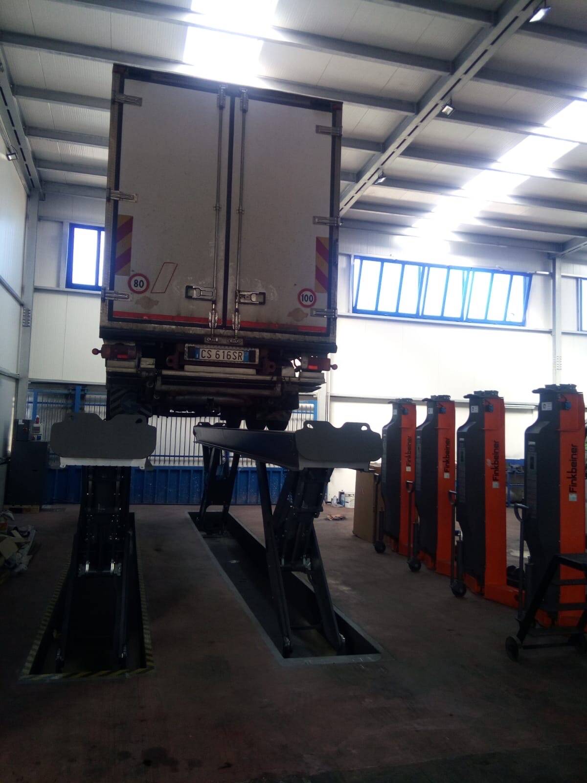 Esempio posa nuovo ponte Finkbeiner a pantografo 300 q. Tecnologia wireless . Anche 4 colonne mobili wireless Finkbeiner 8,5 ton. Iveco Sicilia .