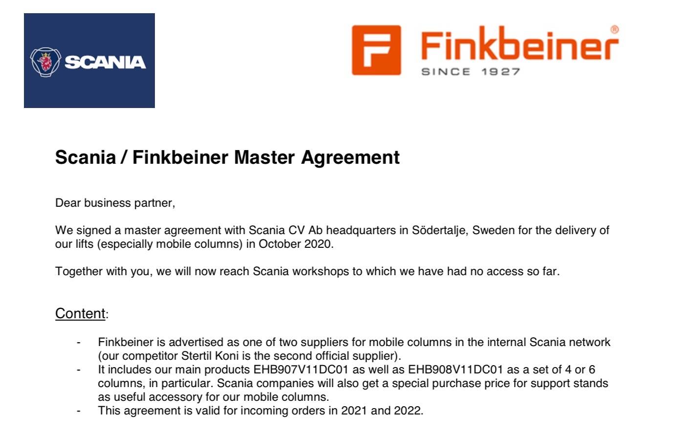 Raggiunto un accordo quadro tra Finkbeiner sollevamento e SCANIA madre Svezia che sancisce oltre che l’affermata qualita’ dei prodotti un trattamento diretto stabilito appunto dalla casa Madre e Finkbeiner . La Global Team srl infatti si impegnerà’ per tutte le officine SCANIA in Italia a rispettare questo accordo fra le parti e a fornire i prodotti Finkbeiner ai prezzi pattuiti in sede SCANIA Svezia .